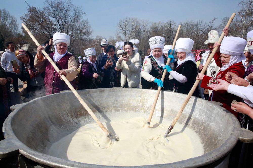↑2023年3月20日丰云股票,在吉尔吉斯斯坦首都比什凯克,人们制作特色食品庆祝纳乌鲁斯节。纳乌鲁斯节(又称诺鲁孜节)是中亚国家最重要的传统节日之一,标志着春天的到来和新的一年开始。新华社发(罗曼摄)
