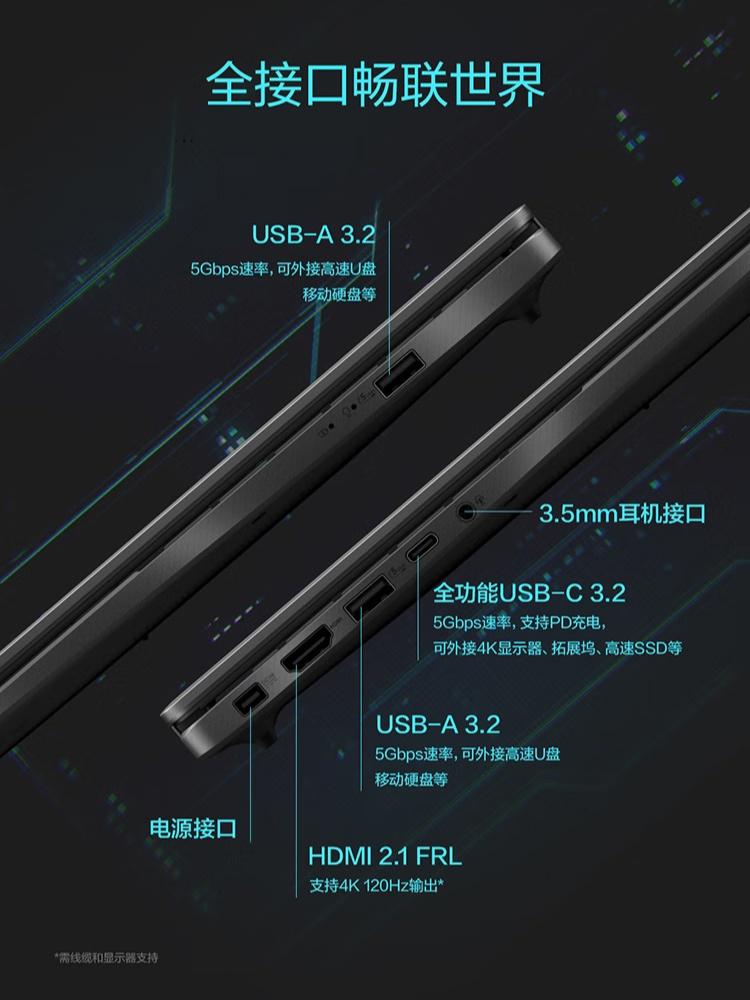该独显全能本内置 Wi-Fi 6E 无线网卡,机身左侧提供电源接口、1 个 HDMI 2.1 FRL、1 个 USB-A 5Gbps、1 个全功能 USB-C 5Gbps、1 个 3.5mm 二合一音频插孔,右侧则提供另一个 USB-A 5Gbps 口。