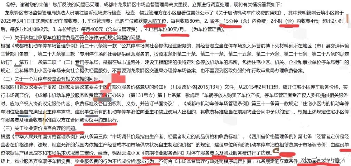 这个当地的官方回应,可谓法理依据充分,针对网友投诉的三条,都逐一详实地解释并得出结论,停车位收费合理合法,不予立案。