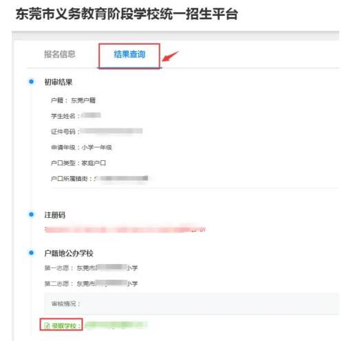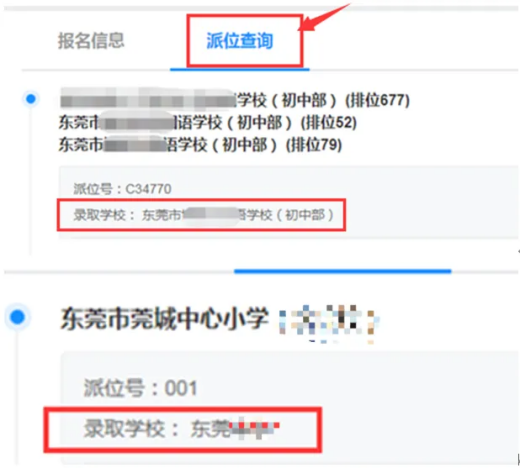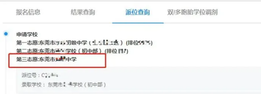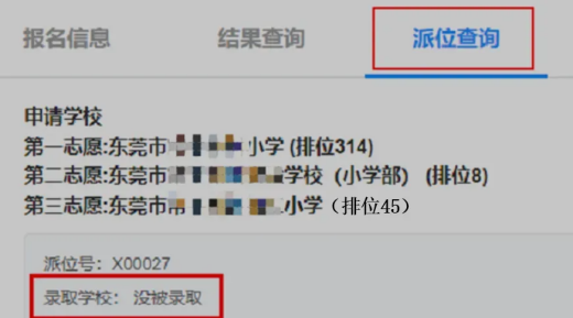 答 登录“东莞市义务教育阶段学校统一招生平台”(下称“招生平台”)的“派位查询”页面查看派位结果。如有被志愿学校电脑派位录取,会在“录取学校”位置公布被录取的具体学校名称(如图1);如果没被任何学校派中的,则在“录取学校”位置显示“没被录取”(如图2)。