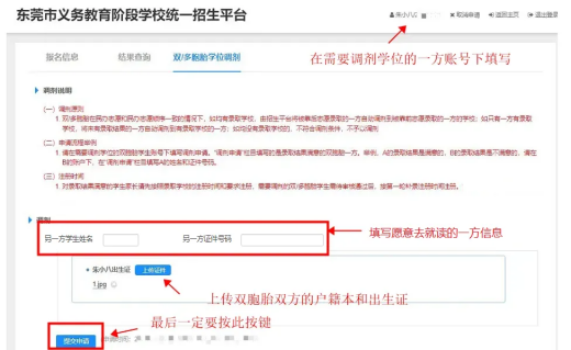 答 举例,双胞胎A和B分别填报了民办学校1和民办学校2作为第一、第二志愿,经摇号,A被民办学校1录取,B被民办学校2录取,请在B的账号下填写A的姓名和证件号码,申请调剂到民办学校1。