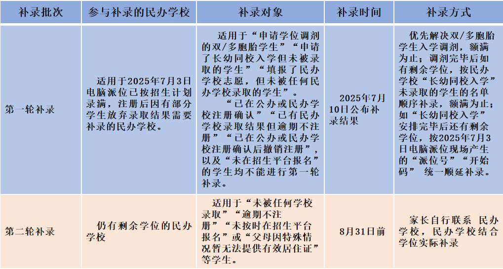答 根据招生工作日程安排,接下来会有两轮民办学校补录机会。具体补录适用对象、补录时间和补录方式见下表。