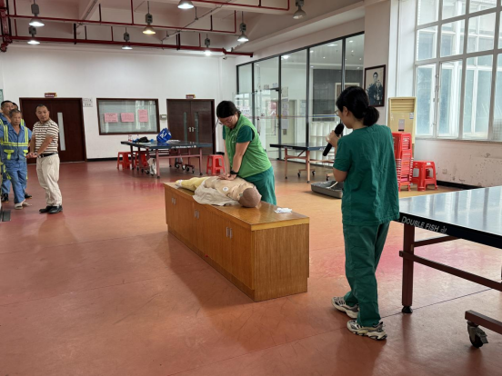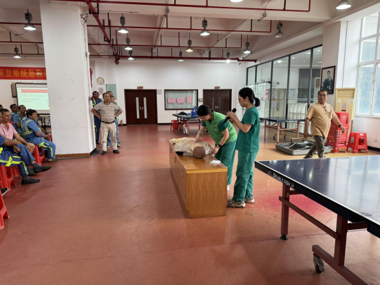 随后,钟村街社区卫生服务中心全科医师邱成媚结合环卫作业实际情况,采取理论讲解与实践操作相结合的方式开展培训。她用通俗易懂的语言,深入浅出、图文并茂地讲解了中暑的基本知识、心梗预防措施以及心肺复苏等急救流程,并让环卫工人亲自动手体验心肺复苏急救操作技能,将急救技能传递到环卫基层一线,切实增强环卫工人的自救互救能力。