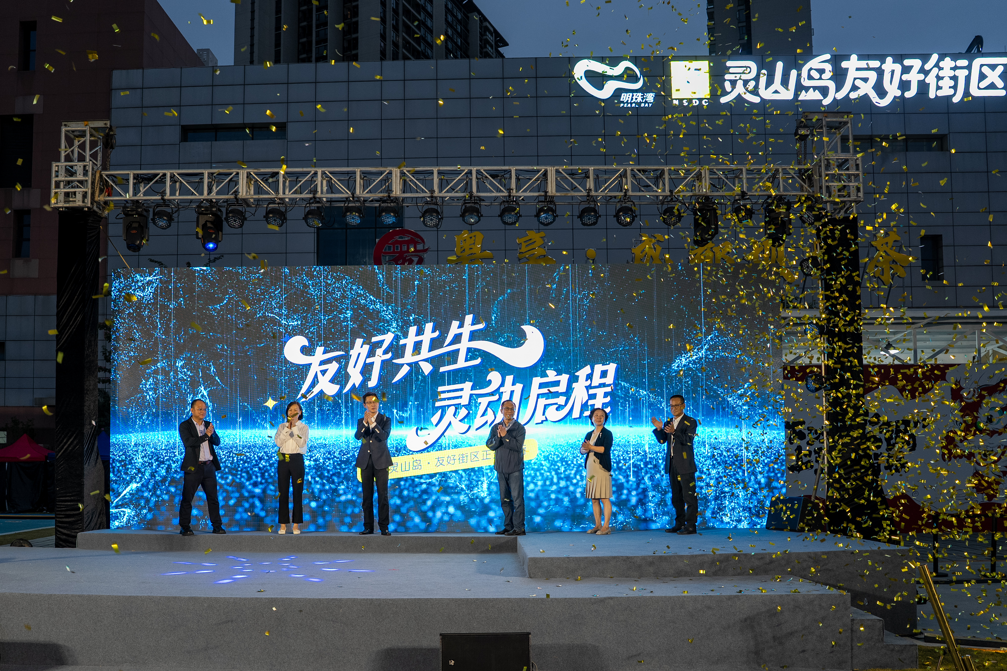 明珠湾灵山岛友好街区开街庆典现场,提琴四重奏、原创歌曲《灵山小夜曲》、现代舞《街区风景》等精彩节目轮番上演,露营椅上的观众挥舞荧光棒随旋律摇曳,与街区的璀璨光影交相辉映,成为“友好街区”理念的生动体现。