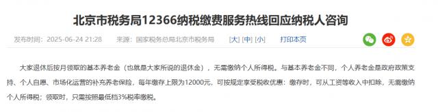 北京市税务局 12366 纳税缴费服务热线回应纳税人咨询称,大家退休后按月领取的基本养老金(也就是大家所说的退休金),无需缴纳个人所得税。与基本养老金不同,个人养老金是政府政策支持、个人自愿、市场化运营的补充养老保险,每年缴存上限为 12000 元,可按规定享受税收优惠:缴存时典丰投资,可从工资等收入中扣除,无需缴纳个人所得税;领取时,只需按照最低档 3% 税率缴税。