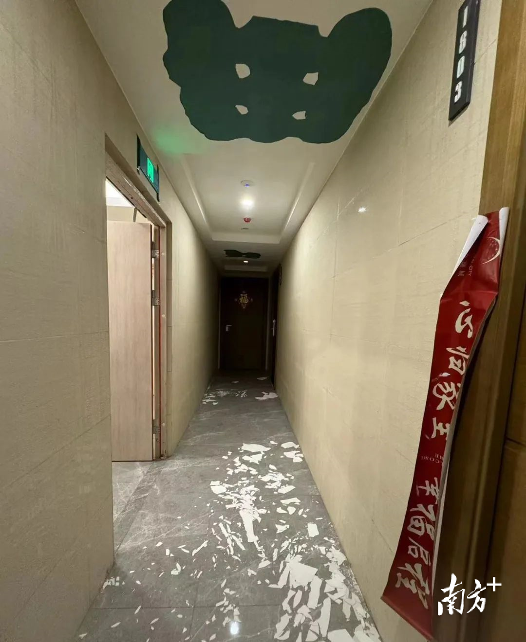 南沙业主反映,铂玥明珠one交付后,楼道天花板掉墙灰,与开发商承诺标准有落差。 图片来源:业主