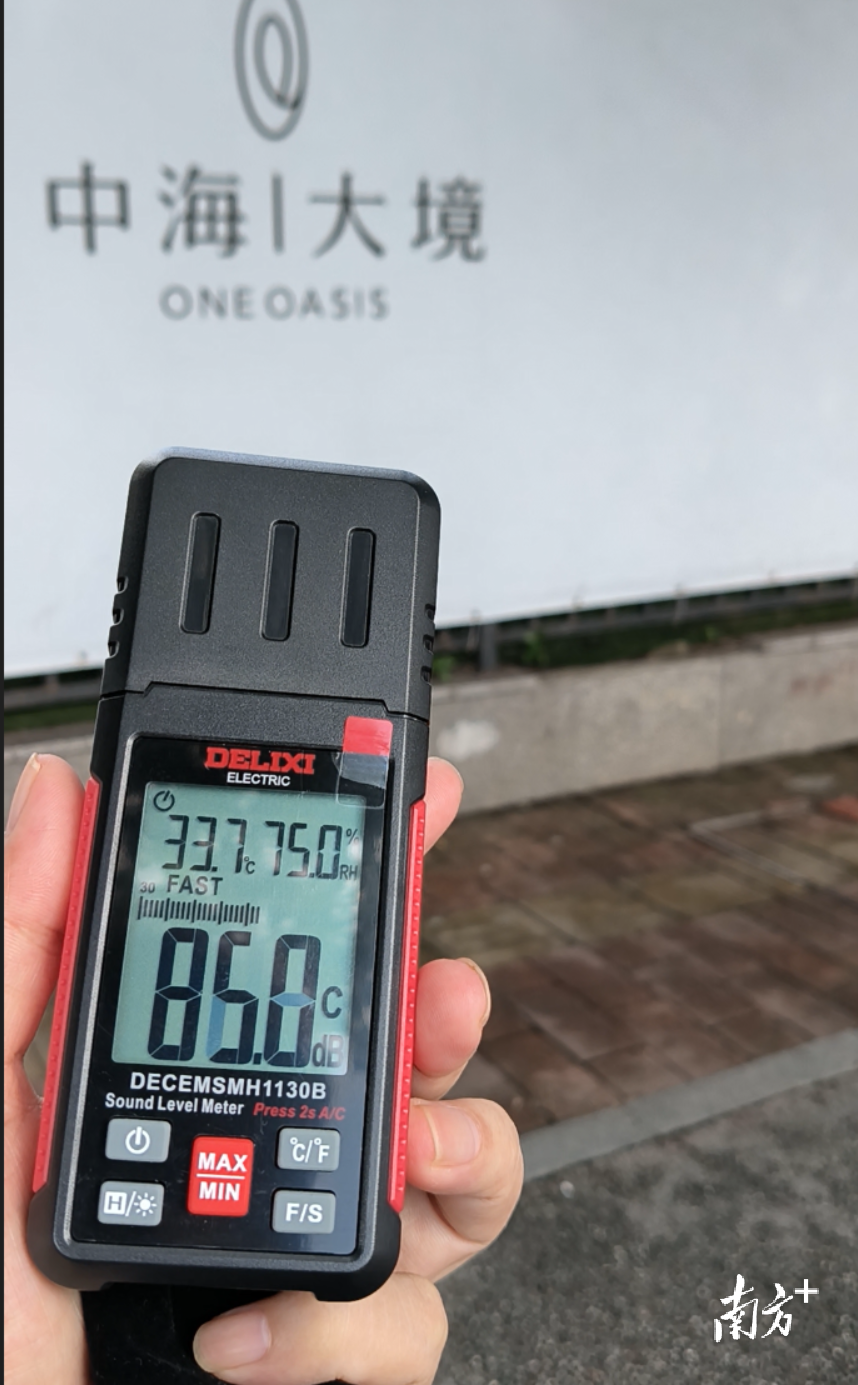 南方+房产频道记者在海珠中海大境路边测得85分贝噪声。