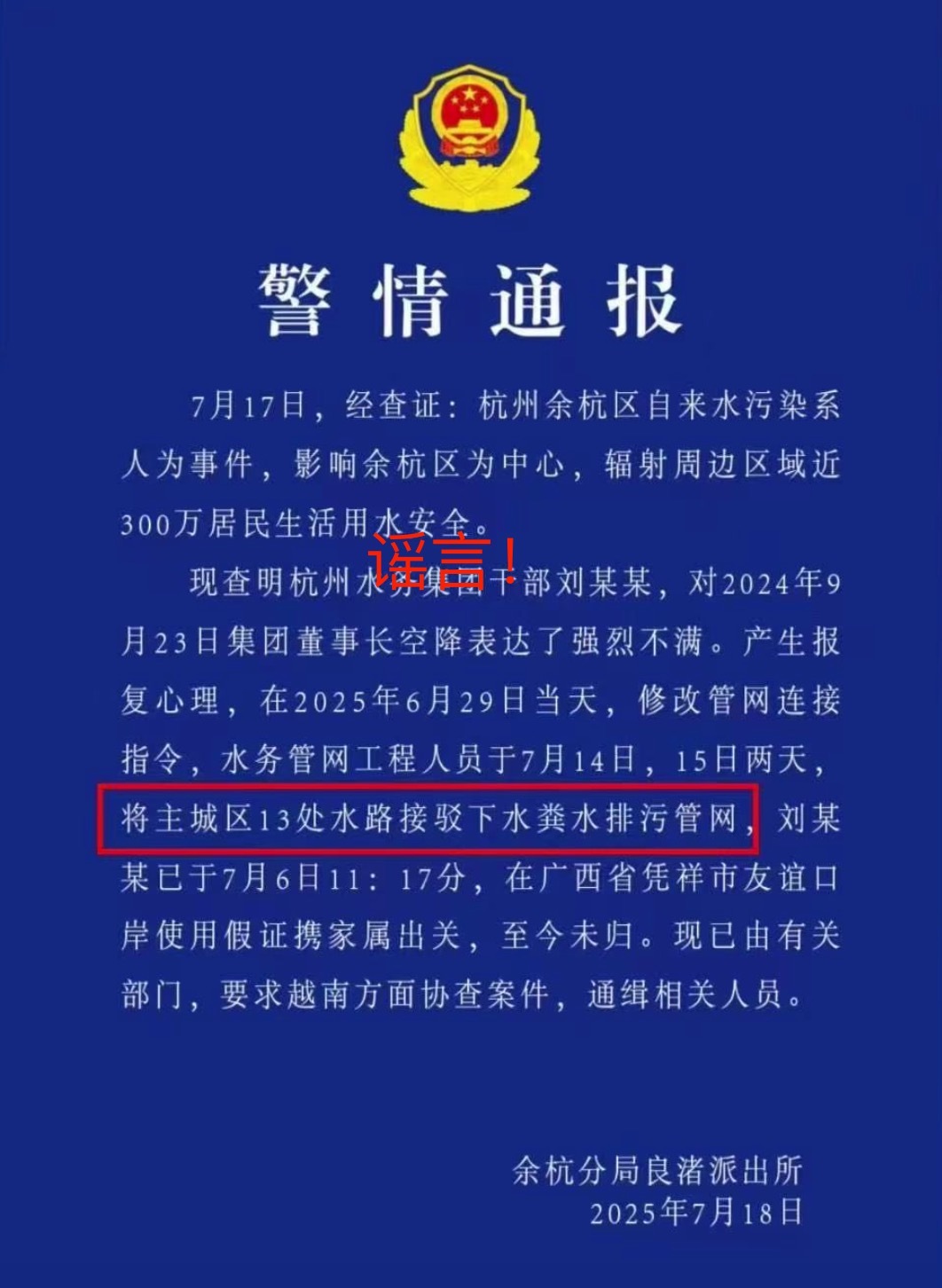 警方通报杭州余杭自来水异味系人为粪水?当地派出所辟谣:假的!