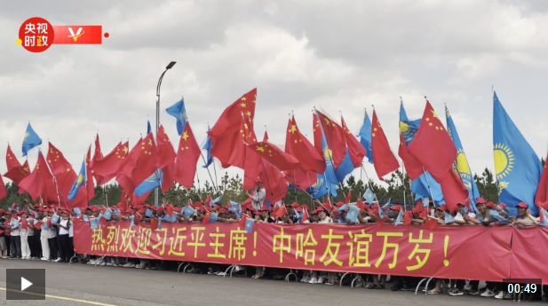 当地时间6月16日中午,习近平主席乘车从机场赴下榻饭店途中,中资企业和留学生代表聚集在道路两旁,手持“热烈欢迎习近平主席!”“中哈友谊万岁!”等红色横幅。哈方直升机沿途护卫,热烈欢迎习近平主席到访。