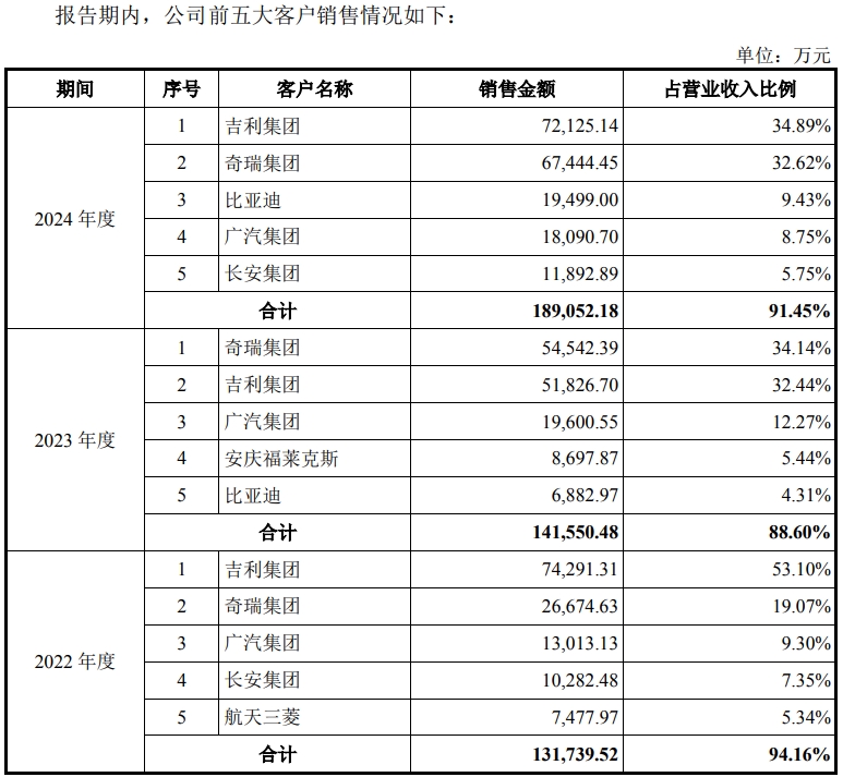 同时,报告期内吉利集团也是丰沃股份前五大客户之一。报告期各期,公司向前五大客户的销售金额为13.17亿元、14.16亿元和18.91亿元,占当期营业收入的比例分别为94.16%、88.60%和91.45%,集中度较高。