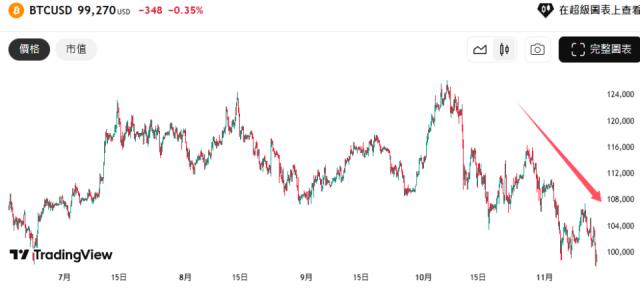 行情数据显示,这一全球最大加密货币隔夜一度暴跌约 4% 至 98000 美元关口下方。从技术面看,比特币自上月 125000 美元上方的历史高位已跌去了逾 20%,迈入了传统的熊市区域。